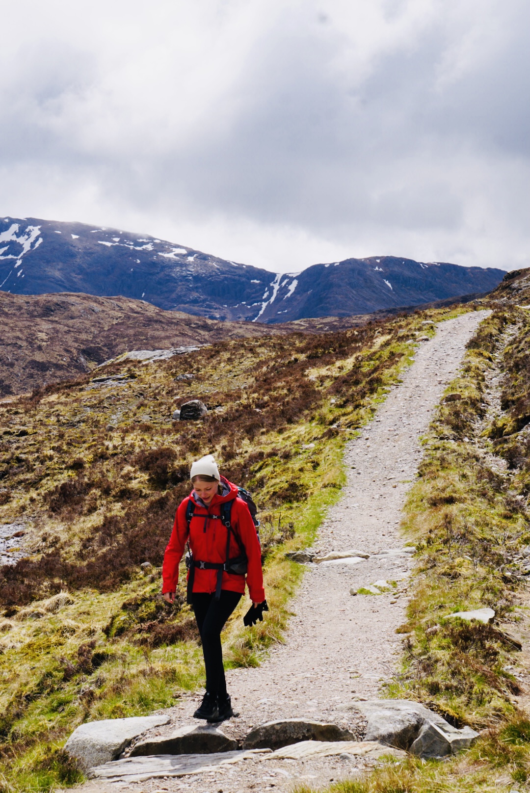 If you travel to Scotland in spring, come prepared for downpour. During the hike, I wore water repellent trekking pants with waterproof hiking boots and sweat wicking top layers under a waterproof shell. There are lots of blog posts from experienced hikers that can guide you on exactly what supplies to bring for a multi-day hike in the highlands, I found this one to be helpful. I also brought city clothes in a roller bag that we trusted to baggage freedom while we were on the trail.